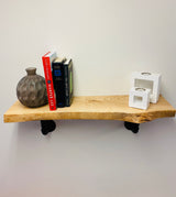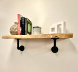 This beautiful wall shelf is handcrafted from solid wood with an oil finish to enhance its natural grain and texture. The shelf supports are made from cast iron Gas Pipe and powder coated with a Matte Black finish. The perfect solution for storage and style in a small space or group multiple shelves together to style a whole wall!
